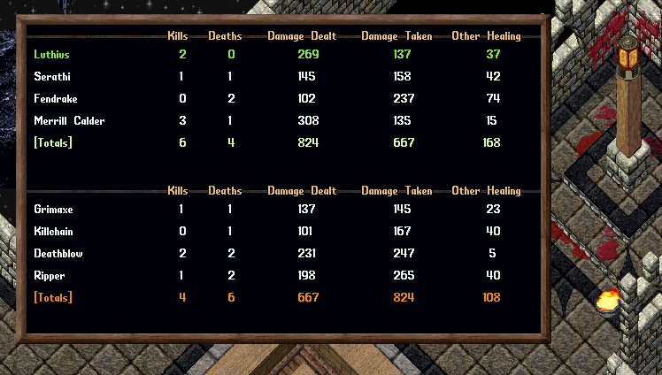 - The Fight Report Menu will show stats of the fight including with Kills, Deaths, Damage Dealt, Damage Taken, and Other Healing